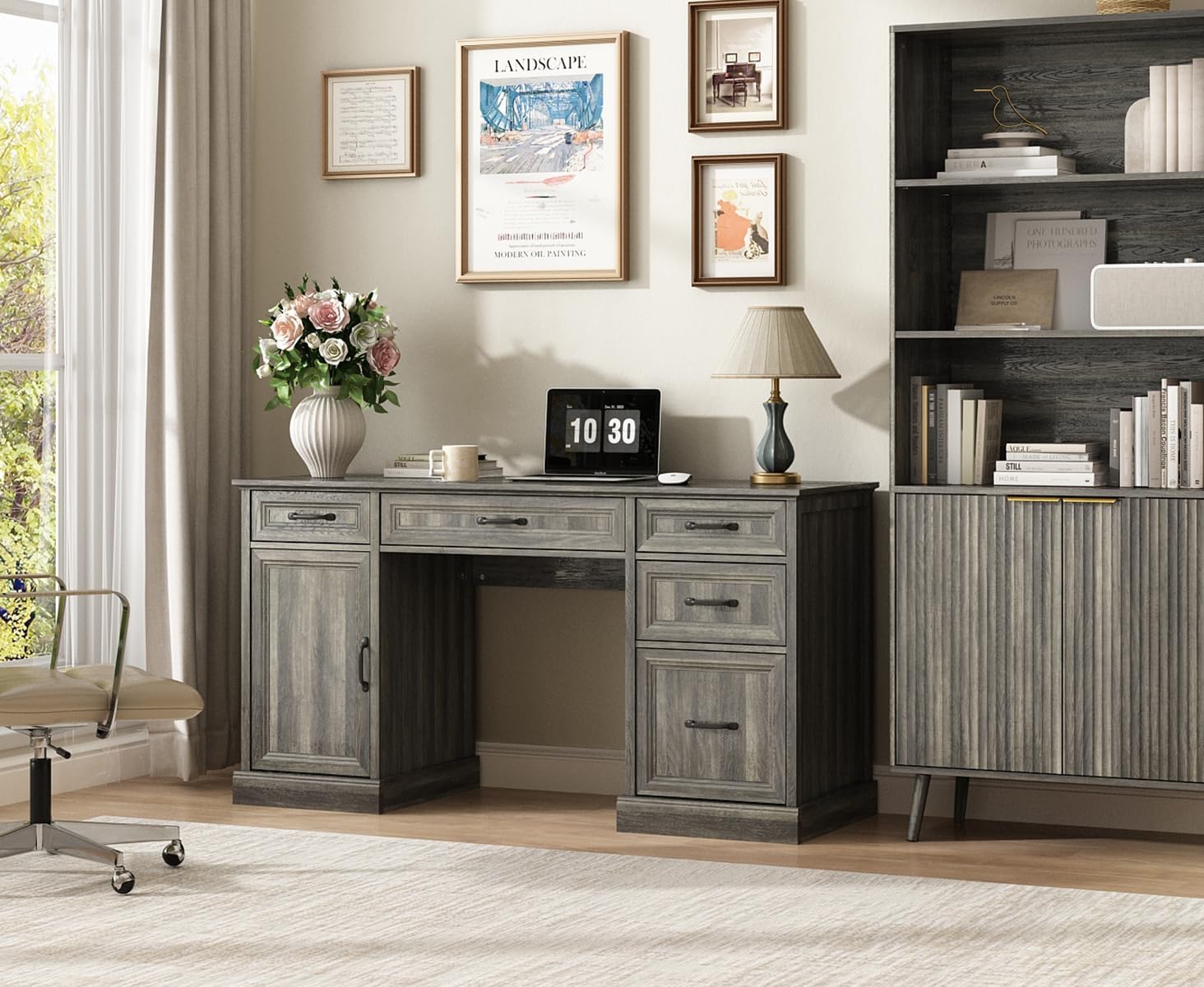 | Storage Options | 3 drawers, 1 file drawer, 2 cabinets |